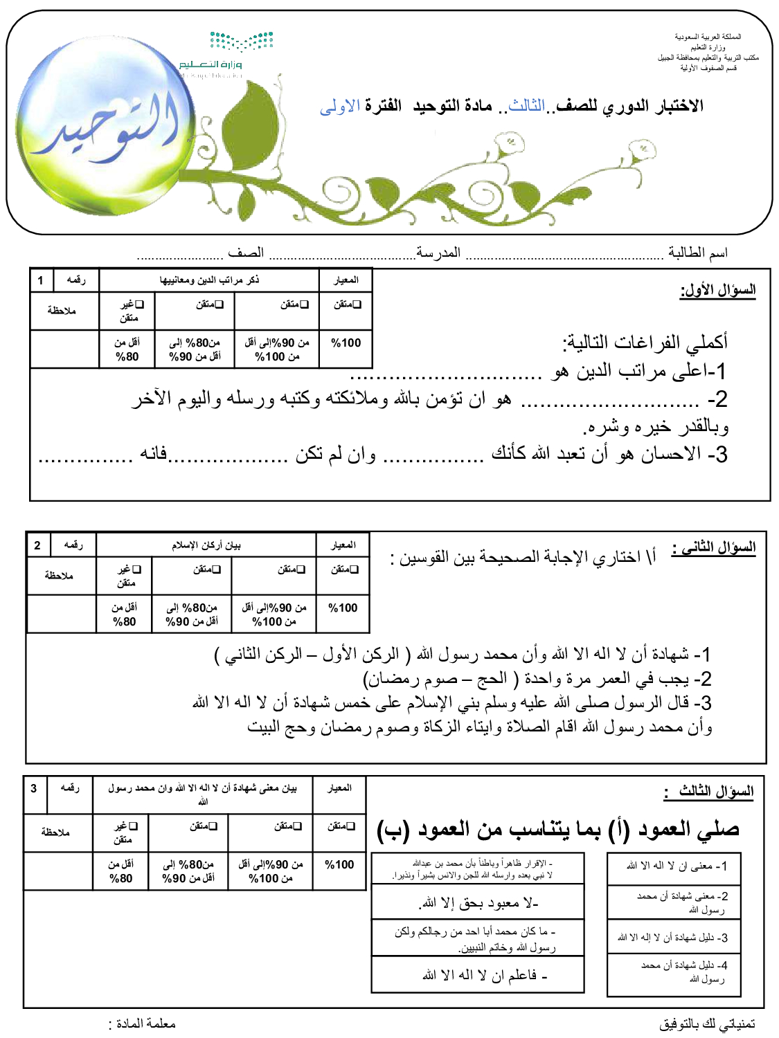 اختبار توحيد فترة أولى نموذج 3 ثالث ابتدائي الفصل الدراسي الأول