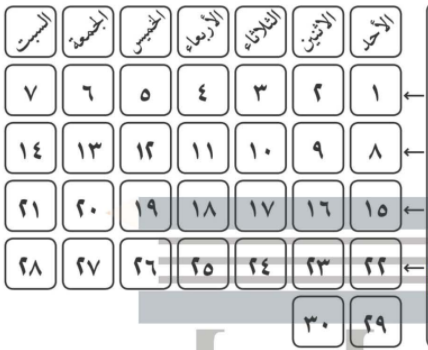 املئى الفراغ فيما يلي ثم لوني أيام كل أسبوع بلون مختلف عن بقية الأسابيع
